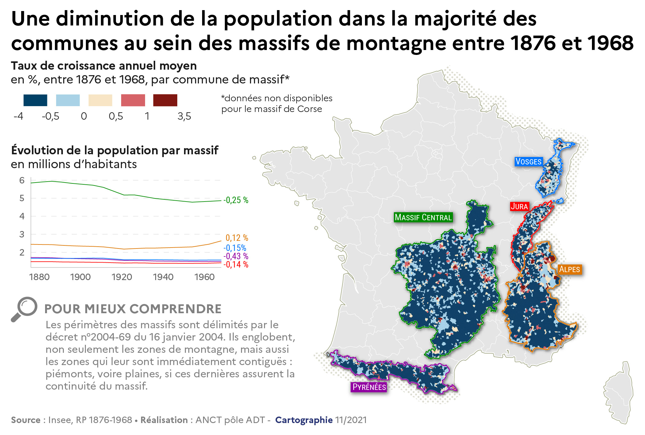 Taux de croissance annuel moyen de la population des communes au sein des massifs de montagne entre 1876 et 1968